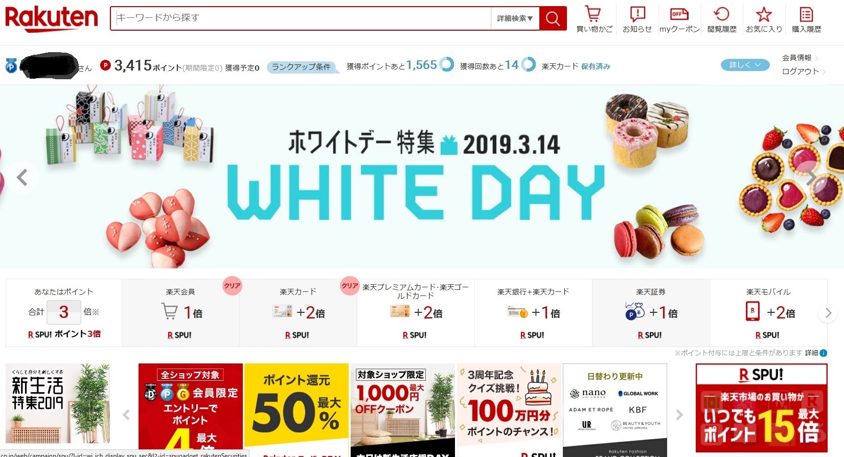 たとえば楽天を見てみますと、現在の自分の会員ポジションや保有ポイントなどが最初に目に入ります。